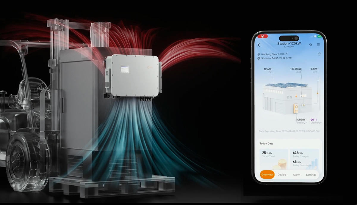 The hybrid inverter is suspended outside the battery cabinet, allowing full exposure to air for superior heat dissipation.